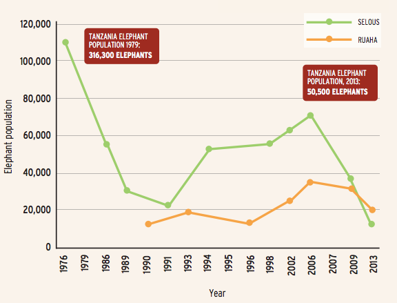 African elephant populations declined steeply during the poaching crisis of the 1980s in Selous and Ruaha national parks in Tanzania. Poaching rates are up again, and elephants are suffering. Source: Environmental Investigation Agency.