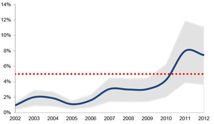 A graph of poaching rates over the last 10 years shows the percentage of all African elephants killed by illegal poaching. The dotted red line represents the annual growth rate of healthy elephant populations. When the death rate exceeds the growth rate, population size decreases. Poaching only accounts for a fraction of all elephant deaths. Source: Proceedings of the Natural Academy of Sciences.